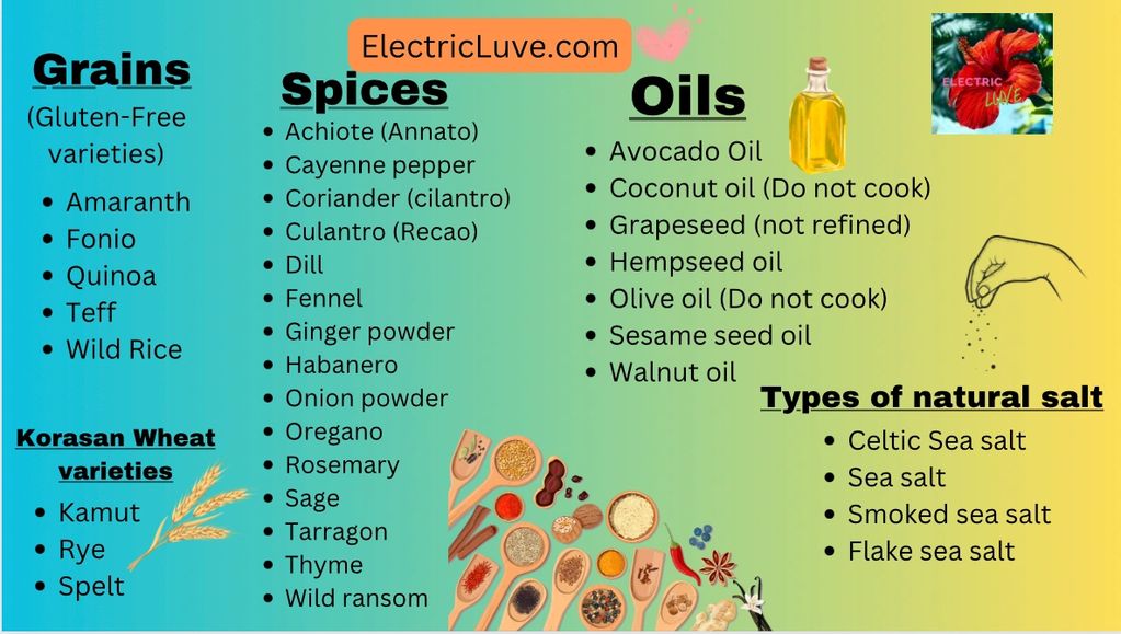 This is a list of daily essentials in the kitchen. First off we have the Gluten-Free grains, consisting of Amaranth, Fonio, Quinoa, Teff, and Wld rice. All of these grains are rich in Iron...Fantastic to boost your immune system.